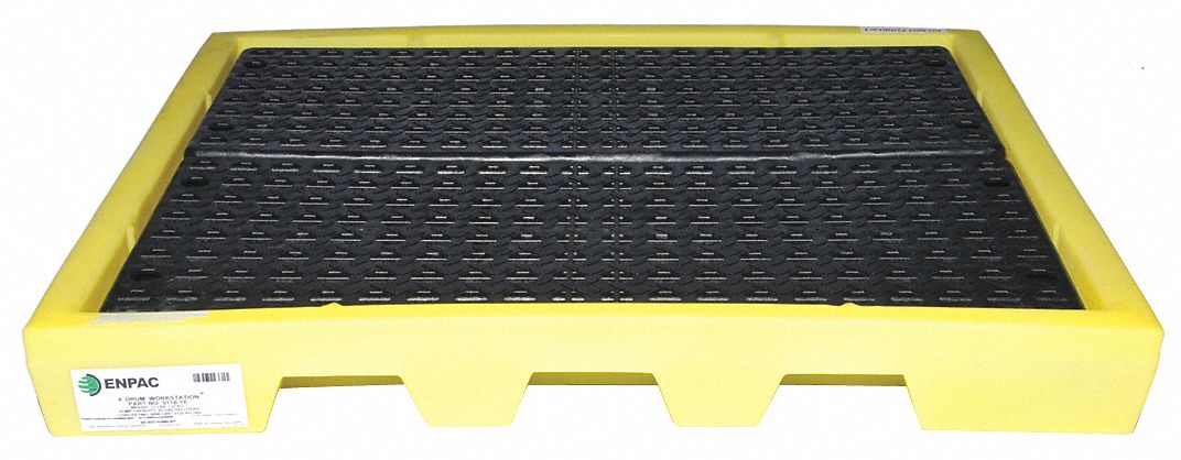 Spill containment pallets 4 drum pallet unit 66 gallon sump capacity 2 000 pounds load bearing capacity 51 inch length 26 1 4 inch width 15 inch height.